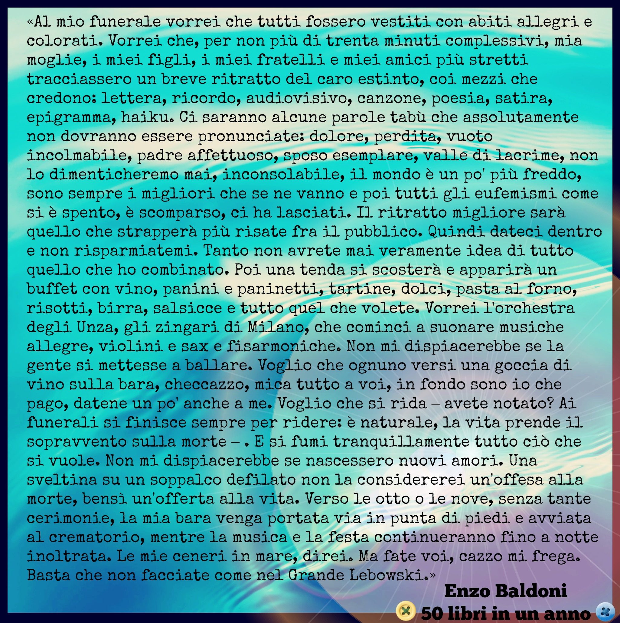 Il 26 agosto del 2004, dopo tre giorni di rapimento, venne ucciso in Iraq Enzo Baldoni, giornalista,blogger, volontario per la Croce rossa, pubblicitario, traduttore e accanito lettore di fumetti. Mi ricordo che su Repubblica uscì un pezzo che aveva scritto su come gli piaceva immaginarsi il suo funerale, un articolo che avevo molto amato. Qui le sue parole: