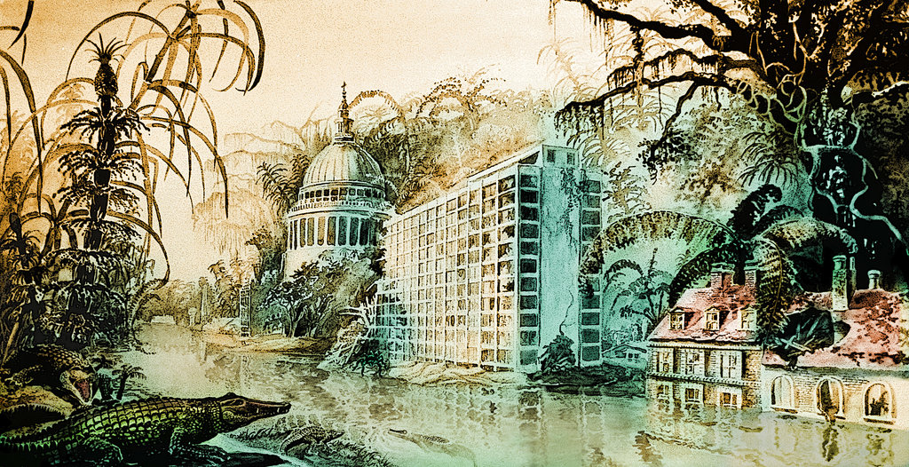 The Drowned World, Il mondo sommerso, è un libro del 1962 di Ballard, il suo secondo romanzo, parte di una serie di storie apocalittiche (libri comunque a sè stanti, non connessi tra loro, che comprendono The burning world e The crystal world), molto ammirata dai lettori di fantascienza speculativa quando l’autore non era ancora conosciuto al grande pubblico per le sue opere adattate ai film di richiamo L’Impero Del Sole e Crash. E’ un libro che viene a volte descritto dalla critica come una versione sci-fi di Heart of Darkness di Conrad, mi pare onestamente un paragone azzardato e pure inutile, anche se qualche richiamo indubbiamente c’è. The drowned world è un romanzo eco apocalittico, o bio distopico, in cui il mondo come lo conosciamo è andato distrutto a causa di una serie di incidenti solari che hanno eroso l’atmosfera, liberando ondate di calore che hanno sciolto le calotte polari, aumentando esponenzialmente la temperatura terrestre fino a valori insopportabili per l’uomo. Con il calore arrivano alti livelli di radioattività e relativa umidità, che fanno prosperare lussureggianti vegetazioni tropicali nelle lagune che ricoprono il globo, riportando la Terra al periodo Triassico. In questo mondo allagato e sommerso, popolato da scimmie, zanzare giganti, iguane e pipistrelli, i pochi superstiti umani sono accumunati da una serie di sogni di antiche lagune e soli fiammeggianti, che gli studiosi teorizzano infine siano non sogni ma ricordi ancestrali dell’umanità, risvegliati da codici temporali presenti in ogni nostro gene che sentono la necessità di riadattare il nostro corpo all’ambiente circostante. Trama e personaggi sono funzionali, quello che conta sono la narrazione e le tematiche, perfettamente realizzate dalla scrittura nitida e pacata, e quando serve lirica, di Ballard. Le sue descrizioni di un sole inclemente, di spettrali cattedrali di edifici sommersi, di antiche vie cittadine rigurgitanti di vegetazione tropicale gigantesca, e di un collettivo incubo dove il richiamo delle iguane risveglia quel punto della corteccia cerebrale che condiviamo con gli alligatori dai tempi in cui i grandi rettili dominavano il mondo, e il ricordo di un’eterna foresta tropicale che chiama a sè con canto da sirena sono elementi che rimangono a lungo nella memoria anche dopo che si è riposto il libro.