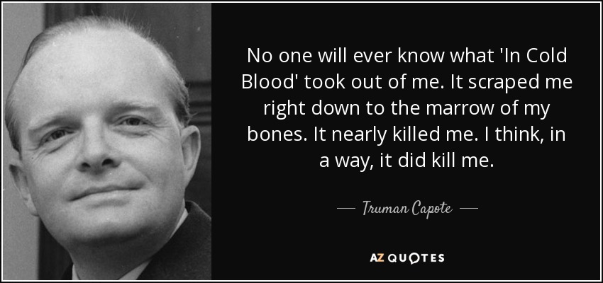 In cold blood rese Truman Capote lo scrittore più famoso di America, è tutt’oggi una pietra miliare nella cultura americana, e il picco della carriera letteraria di questo scrittore. Questo fu l’ultimo libro da lui completato, e non pubblicò più nulla dopo, se non dei racconti che aveva già prodotto. Non riuscì più a scrivere niente.