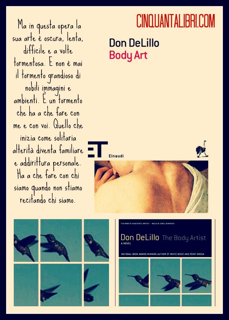 Per fare questo ha usato le riflessioni metapsicologiche di una body artist, Lei e lui, due artisti inseriti in un contesto di solitudine e pace in una casa fronte mare. Lui si uccide e lei passa i mesi successivi in compagnia di un fantasma o un’allucinazione o è una persona con problemi psichici o dello sdoppiamento della sua personalità. Non lo sapremo mai, ma in fondo non ha molta importanza. Sembra che all’autore interessi soprattutto descrivere l’incomunicabilità. Nel farlo costruisce appunto una storia che di incomunicabilità (anche con il lettore) è permeata. Delillo è sempre un’esperienza che trascende i confini del romanzo tradizionale ed amplia le sfumature oltre la logica comprensione dell’umana coscienza. Le pagine in body art sono granelli di acume in nuce disposti ad essere rielaborati in funzione del nostro vissuto esperienziale.