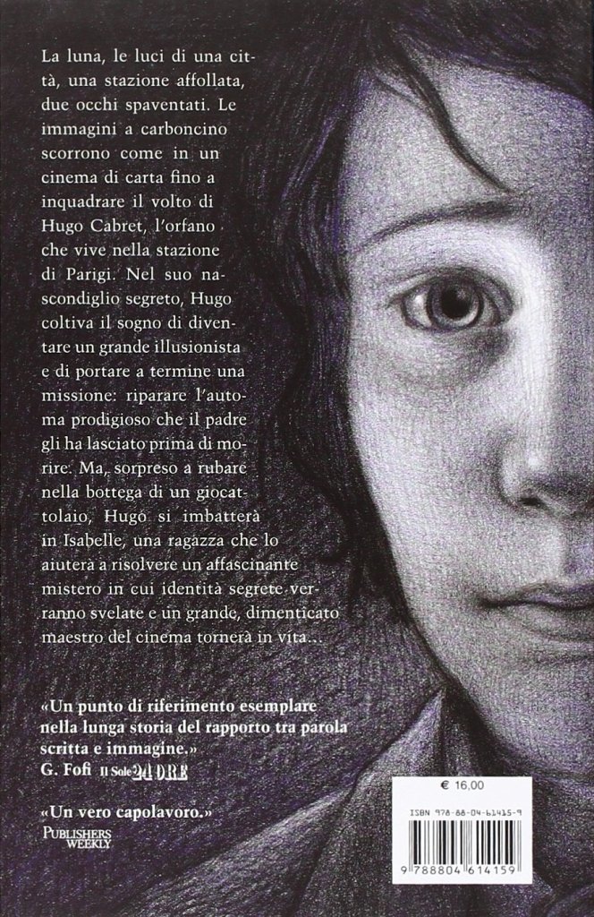 La luna, le luci di una città, una stazione affollata, due occhi spaventati. Le immagini a carboncino scorrono come in un cinema di carta fino a inquadrare il volto di Hugo Cabret, l’orfano che vive nella stazione di Parigi. Nel suo nascondiglio segreto, Hugo coltiva il sogno di diventare un grande illusionista e di portare a termine una missione: riparare l’automa prodigioso che il padre gli ha lasciato prima di morire. Ma, sorpreso a rubare nella bottega di un giocattolaio, Hugo si imbatterà in Isabelle, una ragazza che lo aiuterà a risolvere un affascinante mistero in cui identità segrete verranno svelate e un grande, dimenticato maestro del cinema tornerà in vita. Tra romanzo, cinema e graphic novel, un libro in cui le parole illustrano le immagini.