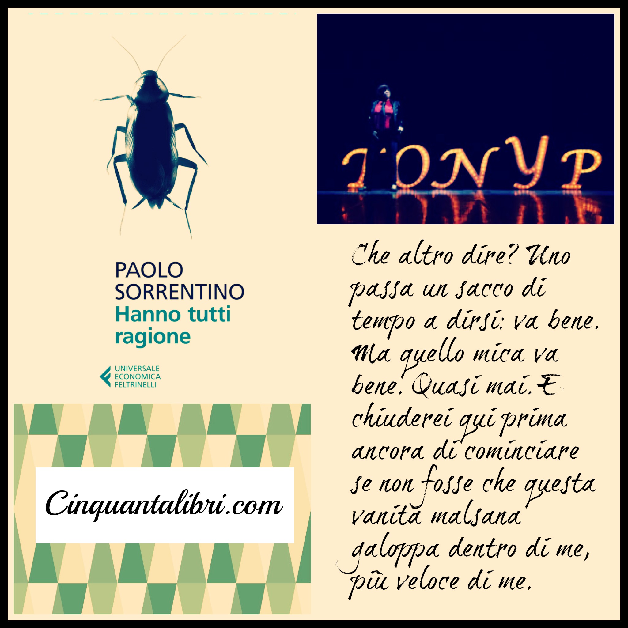 Hanno tutti ragione è un romanzo di formazione della vita adulta, o della vita di quell’adulto che, credo, nessuno vorrebbe essere: Tony Pagoda, il protagonista. Quarantaquattro anni e illudersi di non sentirli ( una bugia raccontata a sè stesso perché tanto gli altri non ci cascano, e lo sa bene), Tony Pagoda, il cantante neomelodico-falsojazz-pienodisè-ossimorodissacrante-stereotipoitalianovivente esportato all’estero ad uso e consumo degli italiani espatriati: chi vorrebbe essere come lui?!