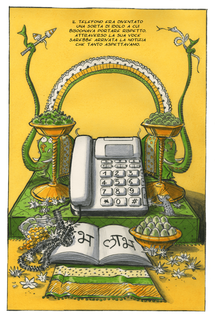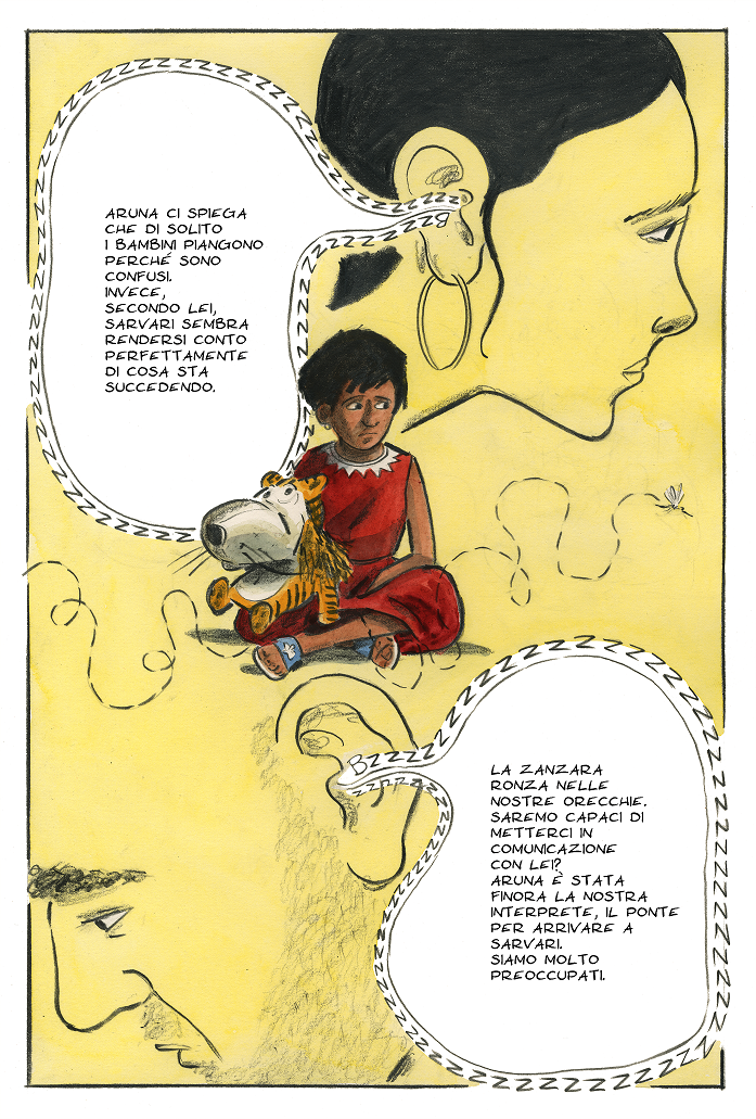 Il racconto delle vicende che qualche anno fa hanno vissuto l’autore, la moglie e la loro figlia Sarvari. Una zanzara nell’orecchio è una storia sulla famiglia – sull’idea di famiglia, sulla costruzione di una famiglia a cavallo tra Genova e Mumbai – ma è anche una storia fatta in famiglia. Andrea ai testi e ai disegni, la moglie Daniela Mastrorilli ai colori. Sarvari ha dato il via libera, di più, ha spinto i genitori a raccontare.