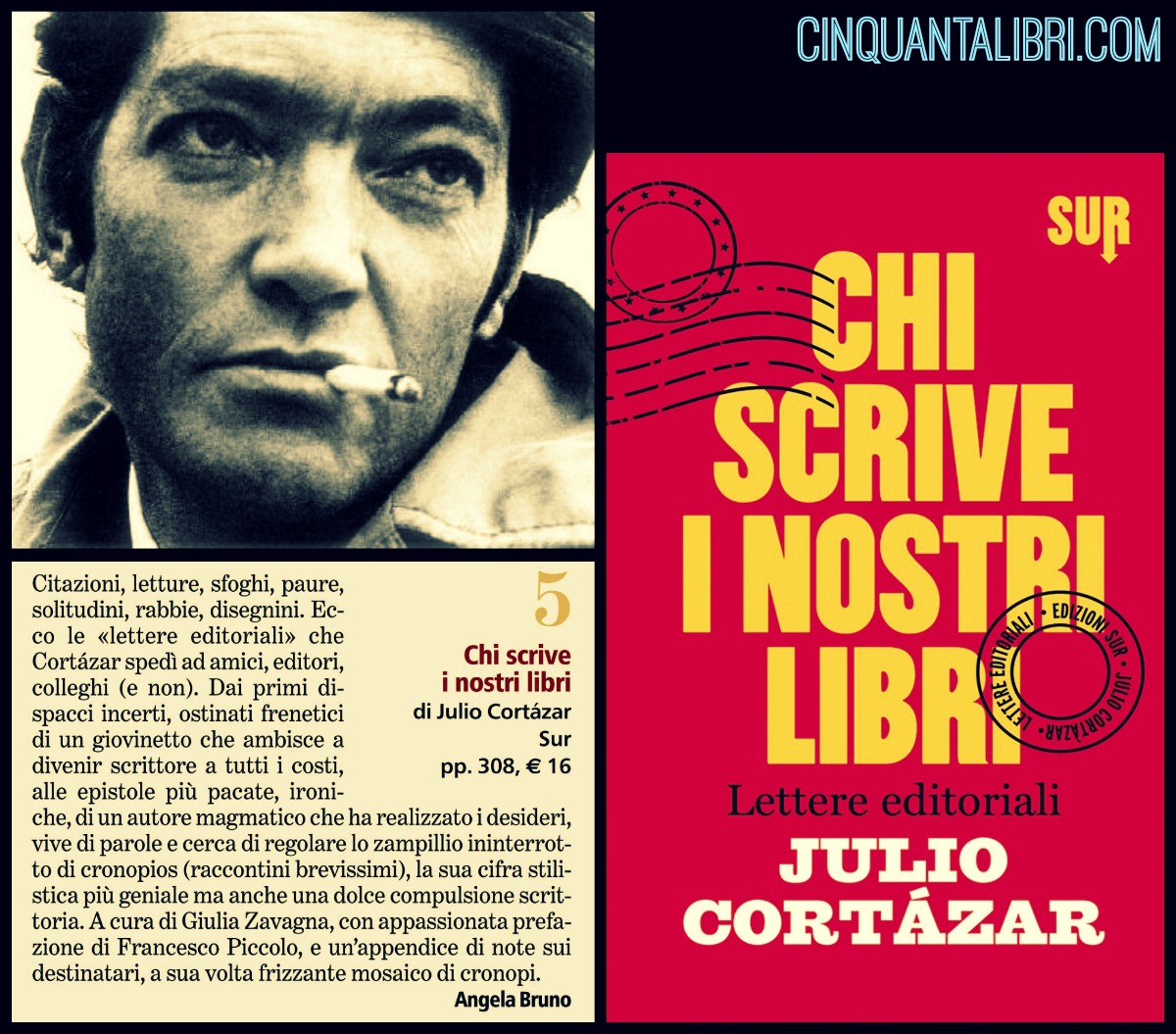 Lo consiglio e straconsiglio. Un tassello, minuscolo, dell’immensa corrispondenza cortazariana (più di 1800 lettere, scritte a partire dal 1937, fino al 1984, a pochi giorni dalla morte), raccolta da Alfaguara in cinque volumi, e pubblicata da SUR in tre volumi a selezione tematica. Il primo, Carta carbone, raccoglie le lettere ad amici scrittori, mentre il terzo si concentrerà sulla corrispondenza di carattere politico. Questo Chi scrive i nostri libri è appunto il secondo volume, dedicato alle lettere editoriali – dirette a editori, giornalisti, traduttori, critici letterari, registi – che ripercorrono da dietro le quinte la genesi e lo sviluppo di Cortázar come scrittore, e di molte delle sue opere più famose.