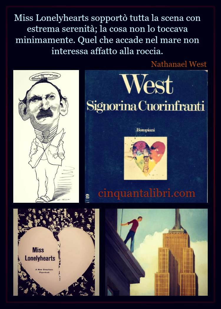 Signorina Cuorinfranti (Miss Lonelyhearts, del 1933) è un romanzo breve di poco più di cento pagine, che inaugura un’idea poi ritrovata in una serie di altri libri e brillanti film di Hollywood: un giornalista squattrinato viene incaricato dal suo redattore, cinico e arrivista, di gestire la “posta del cuore” di un noto quotidiano, sotto lo pseudonimo di Signorina Cuorinfranti, appunto. In genere, questo motivo viene declinato nei toni del rosa o del giallo-rosa, nelle varie pellicole: ma West è uno scrittore realista, e sceglie un’angolatura diversa, vera, dolorosissima.